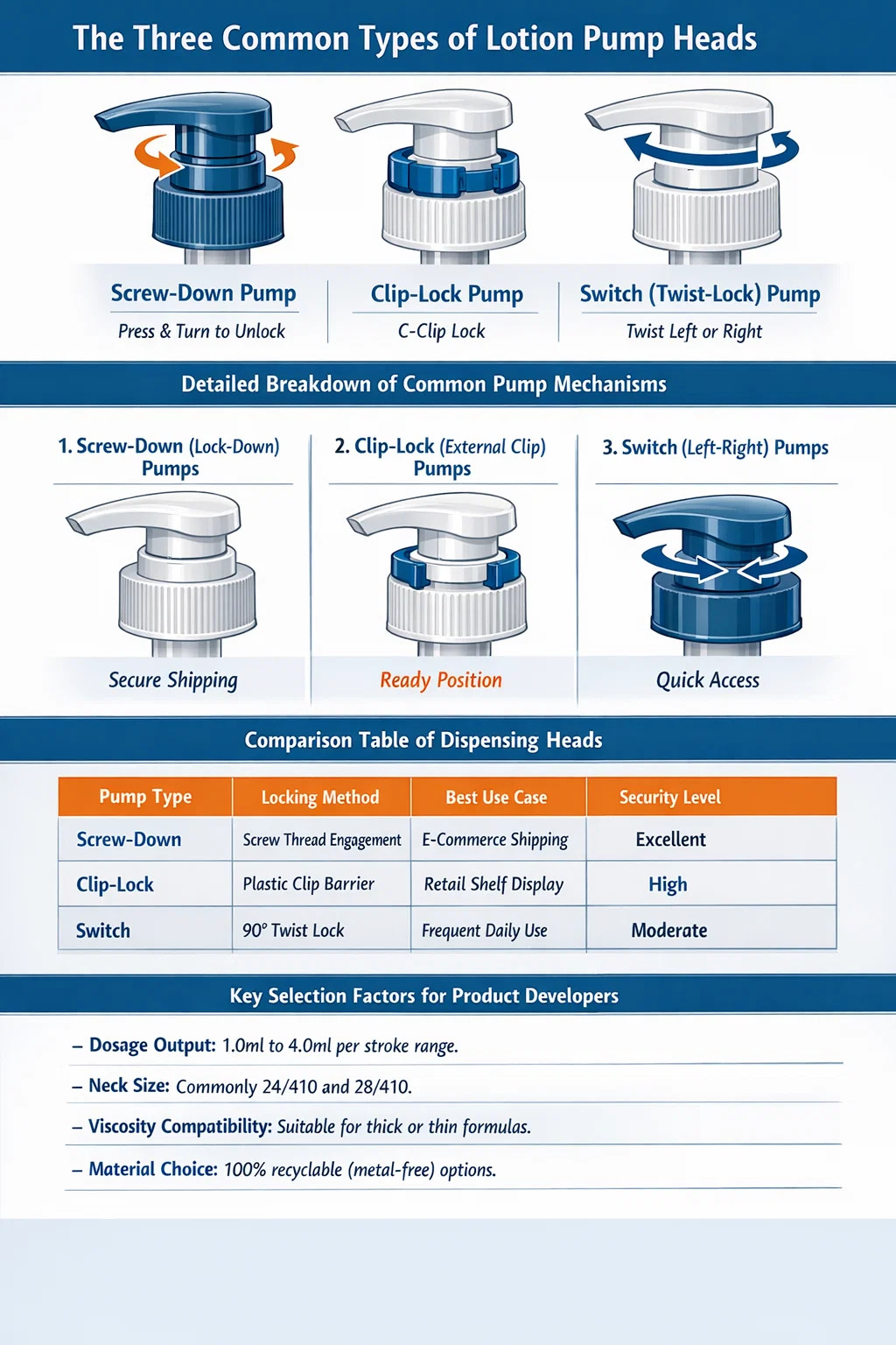 Pakkausteollisuudessa termi Mitkä ovat kolme yleistä pumpputyyppiä? viittaa erityisesti nesteiden kiinnittämiseen käytettyihin lukitus- ja annostelumekanismeihin. Kolme yleisintä tyyppiä ovat Kierrettävät pumput, Clip-lock-pumput ja Vaihda (Twist-lock) -pumput . Jokainen on suunniteltu estämään vuodot kuljetuksen aikana ja tarjoamaan samalla erityisen käyttökokemuksen päivittäisen käytön aikana.
